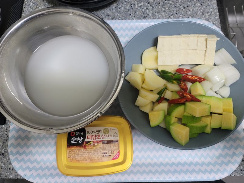 7. 이제 준비해둔 야채 중 감자와 쌀뜨물 넣고 끓입니다.