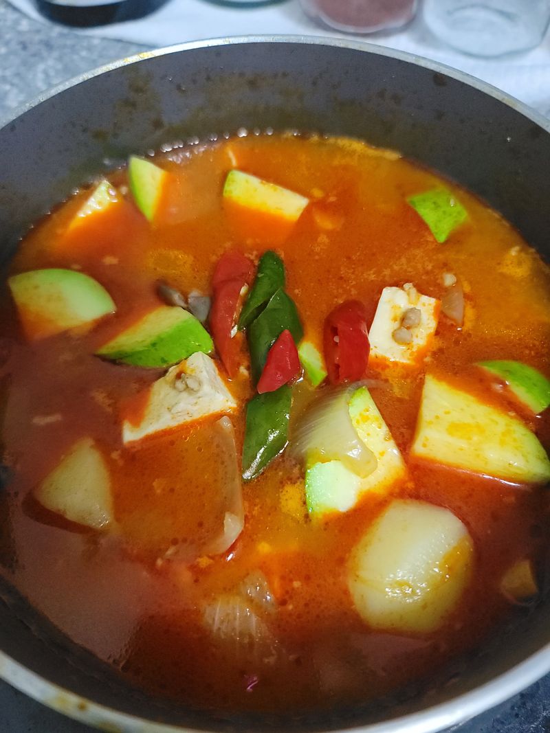 9. 어느정도 감자가 익었을때 호박과 양파 고추 두부 버섯을 썰어 넣어줍니다.