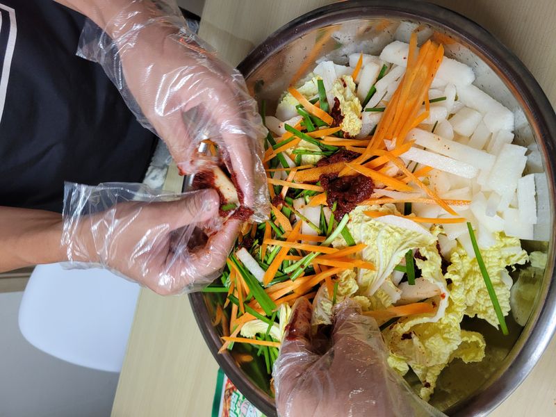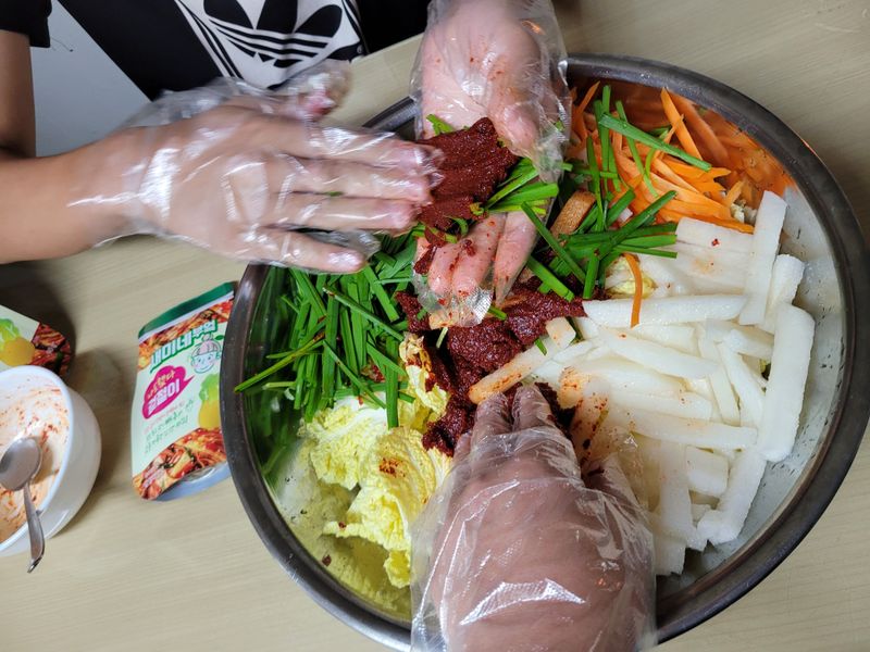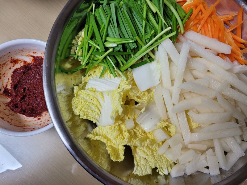 오..무랑 당근이랑 야채가 같이 더 들어가니 먹음직스럽고 너무 제대로여요~ 겉절이~~배고프게 하네요~