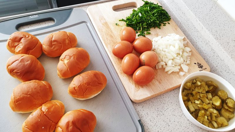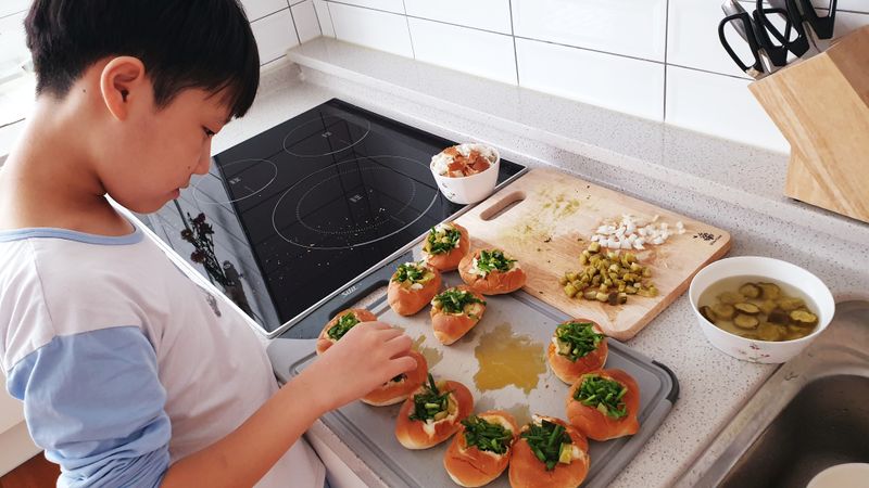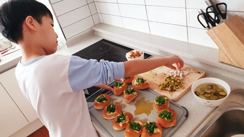 아이랑 함께 재료 다지고, 계란깨고, 가장 재밌던 모닝빵 손으로 파내기 ㅎㅎ 그리고 소금톡톡^^