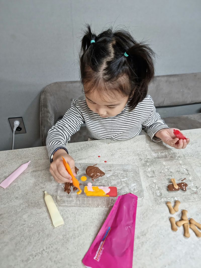 하원하고 노래를 부르던 할로윈 초콜릿 만들기를 했어요 ㅎㅎㅎㅎㅎ 요새는 초콜릿펜이며 다 잘나와서 재료 구하기도 쉽네요 ㅎㅎ 아주 입이 귀에 걸린 딸랑구네요