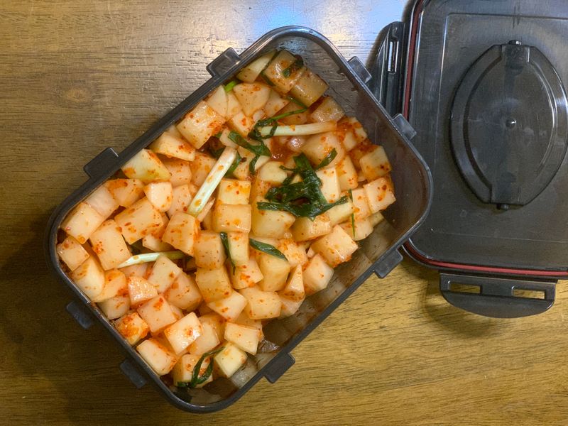 1kg의 무를 다 자른후, "나도했다깍두기양념"에 1시간 재웠어요.