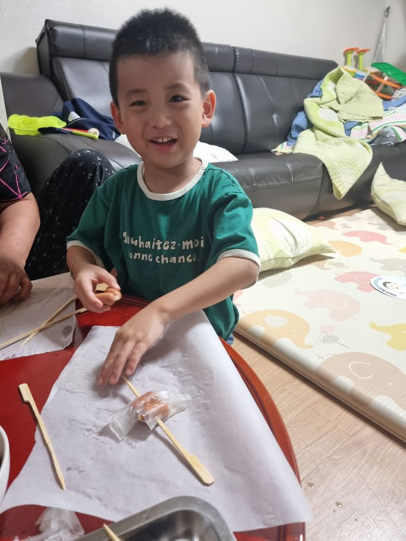 미끌미끌 말랑말랑해서 기분이 좋다고 말하는 애기들. 열심히 소세지에 말아서 꼬치 완성이네요