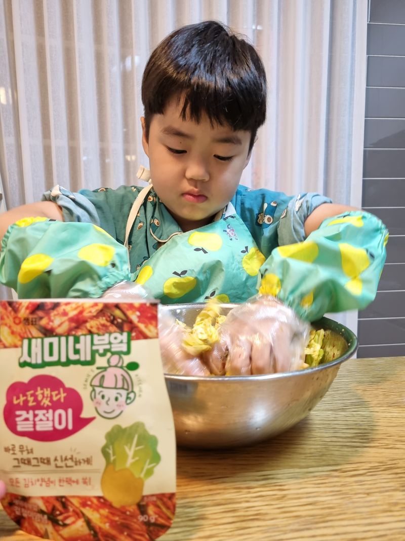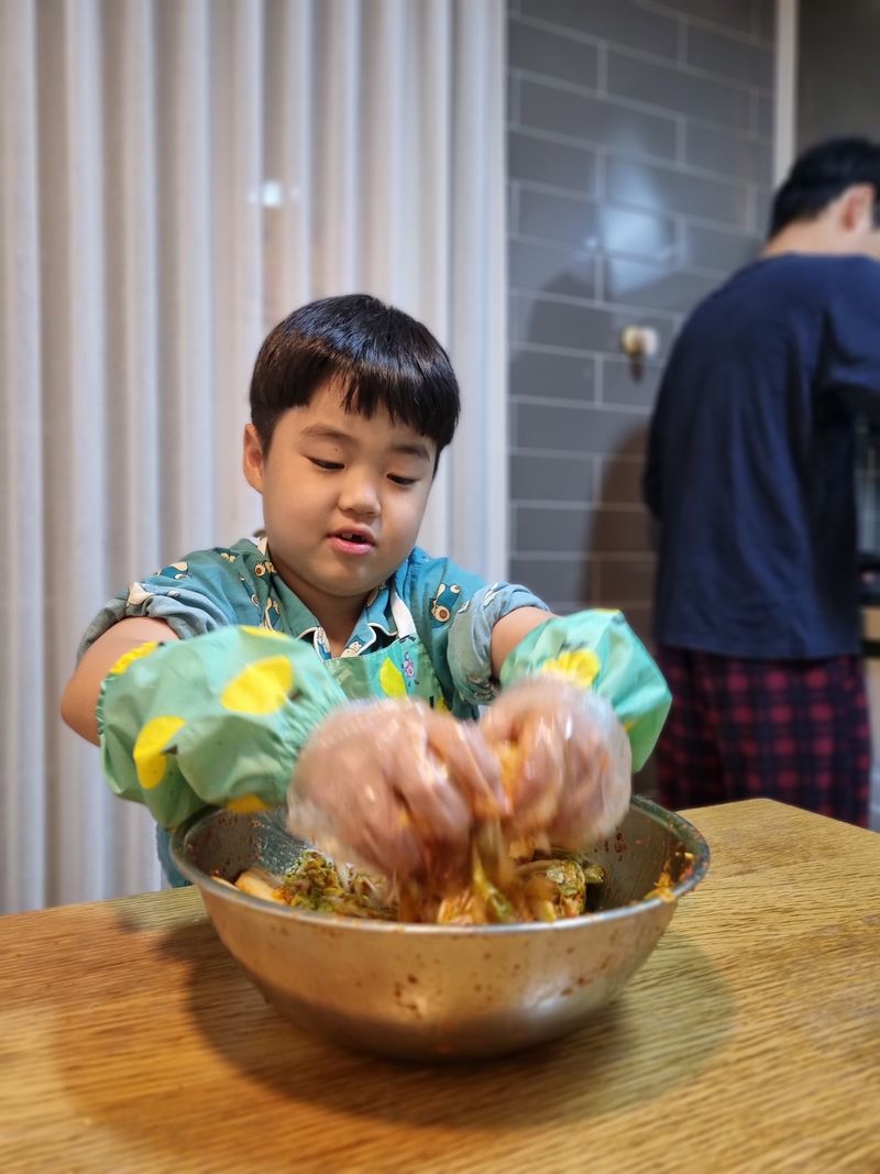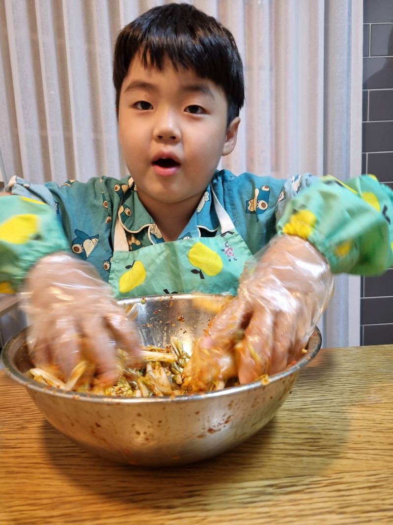 배추도 자르고 오른손으로 비비고~ 왼손으로 비비고~ 양손으로 주물주물~~