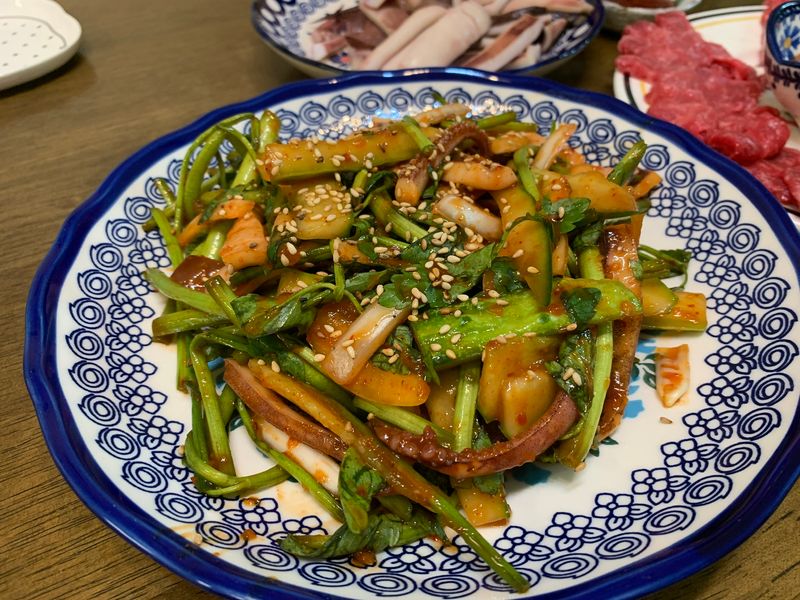 신선한 오징어를 손질 후 오이와 미나리를 넣고 샘표 비빔장으로 맛있게 비볐습니다.