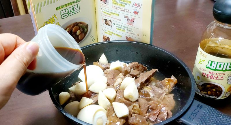 3.냄비에 소고기.계란.메추리알.마늘을 넣고 새미네장조림소스와 물을 2:1 비율로 넣는다