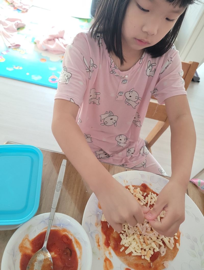 만들기도 간단하고 간편하기는 이보다 쉬운요리가 없어요 ㅎㅎ 애들도 엄마도 즐겁고 재밌는 요리는 피자만들기 재료는 다양할수록 좋지만 또띠아와 모짜렐라 치즈만있어도 좋아요 집에 고구마가 있거나 토마토 소스도 주가하구 양파 파프리카 햄등 다양한재료를 넣어봐요 거짓말 초큼 보태서 파는 피자보다 더맛나요 한번만들어보세영