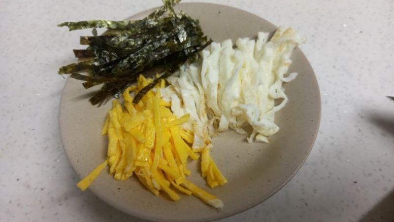 계란으로 지단만들고 김도 살짝 구워서 올렸어요