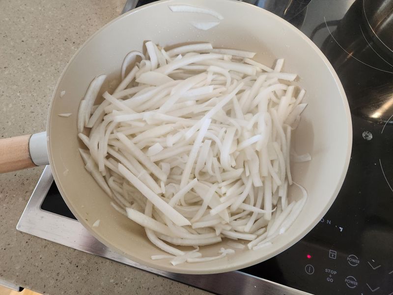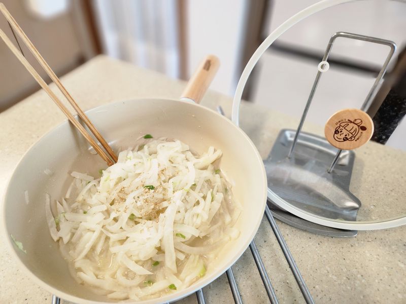 요즘 무가 저렴해서^^ 무나물 자주 해요! 봄까지 너무 맛나게 먹을수있는 요리죠~ 1.무를 잘라주세요 2.소금으로 절여주세요 3.기름+마늘 볶다가 저려놓은 무를 넣어주세요 4.숨죽을때까지..볶아주세요.(파추가) 5.뚜껑닫고 익혀 주세요. 6.연두로 간을 해주세요.들기름도 취향대로 넣어주세요! 너무 맛나게 잘먹었네유♡ 완성^^ 연두는 진짜!!어디든 잘어울리네요
