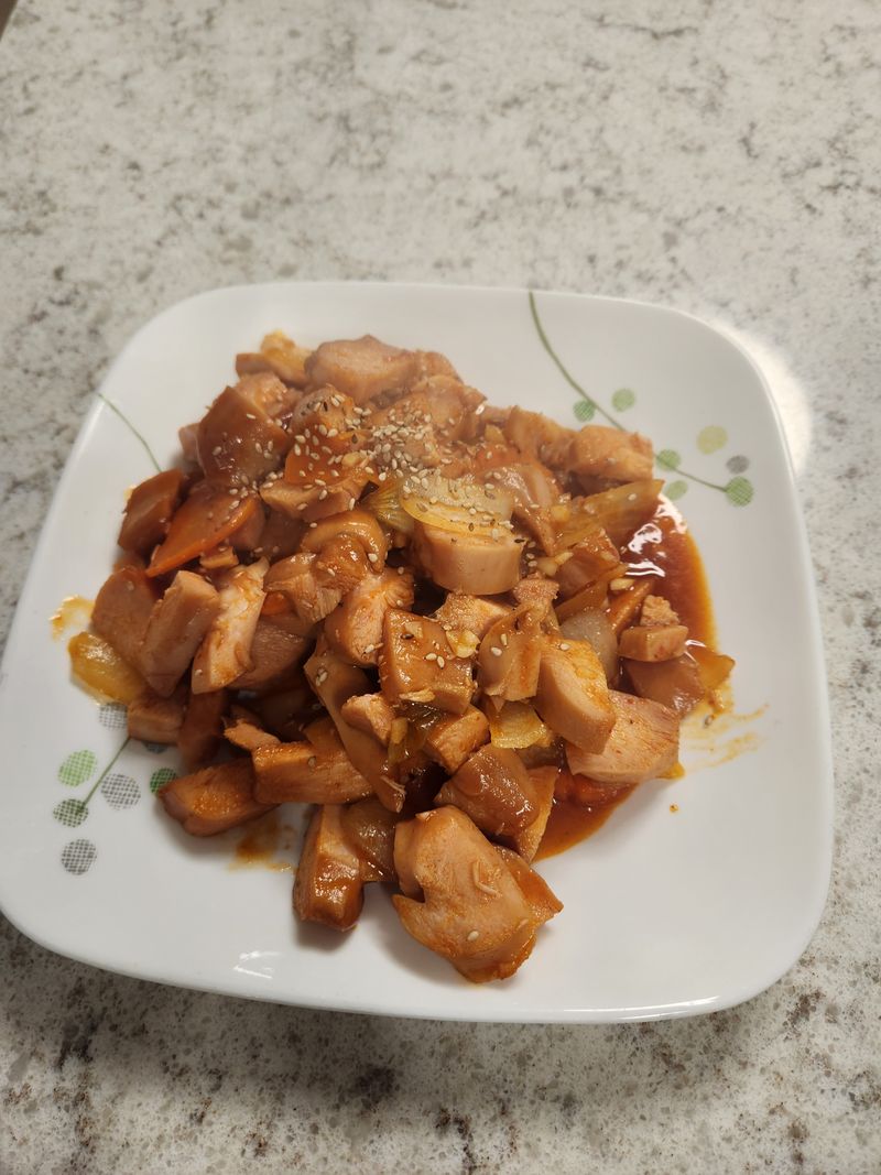 냉동 닭가슴살을 전자렌지에 3분 돌리고 썰어서 양파 당근 등 짜투리 야채와 볶다가 케찹 고추장 다진마늘 올리고당을 넣어 마무리하면 간편한 닭가슴살 쏘야 완성^^♡