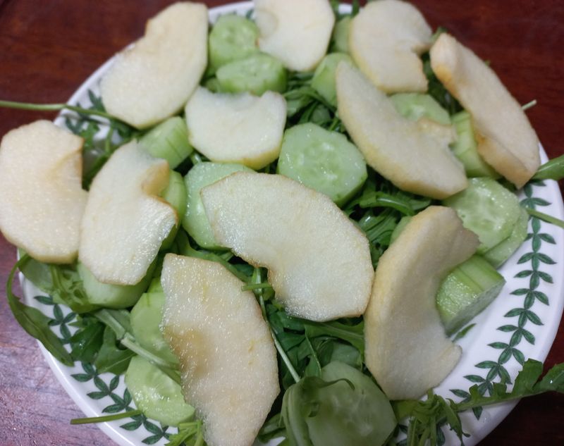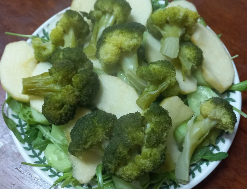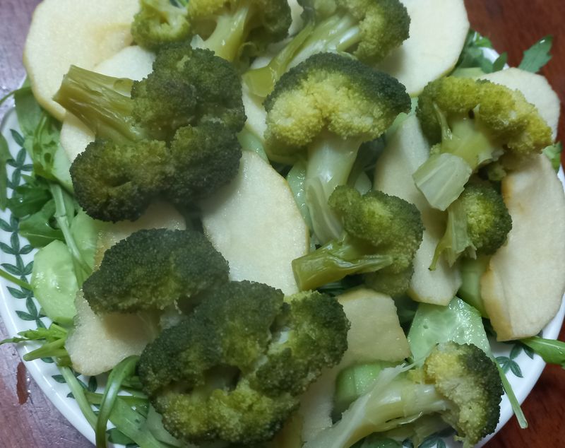 마찬가지로 브로콜리를 삶아서 루꼴라와 사과, 오이등등과 함께 셋팅하고 올리브오일, 소금, 후추, 식초를 합친 소스를 뿌려주면~~쌉싸름한 루꼴라를 상쇄시켜주면서도 건강한 샐러드 완성~