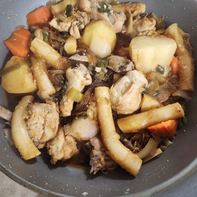 냉동고에 있는사골국물과 묵은지김치랑 햄 두부 등등 넣어서 뽀글뽀글 끓였네요~ 국물이 찐한게 좋네요