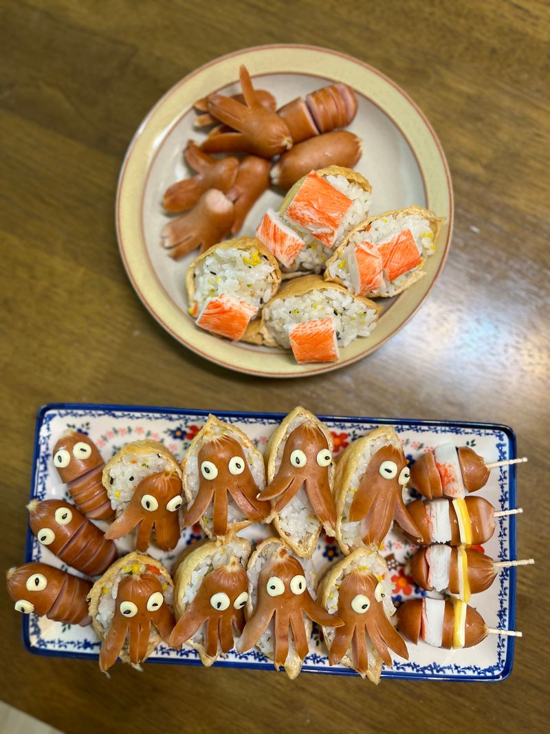 소세지에 칼집을 넣고 데쳐서 아이들약병 뚜껑으로 치즈를 찍어서 눈을 만들고, 검은깨는 유부초밥 재료에서 검은깨를 빼서 했어요ㅎㅎ