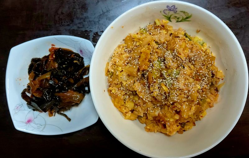 퇴근 후 피곤하지만 가족들을 위해 저녁을 차려야하는 주부의 고민! 맛있으면서 푸짐한 깍뚜기 볶음밥고 지진 파김치 많이 익은 깍뚜기, 호박, 양파,계란과 찬반을 볶고 마지막에 참기름과 깨소금 솔솔 많이 익은 파김치 그냥 먹기 힘들땐 들기름과 설탕 넣고 푹 지져주면 언제나 먹어도 맛있는 찐 파김치 간단하지만 푸짐한 오늘의 저녁밥상