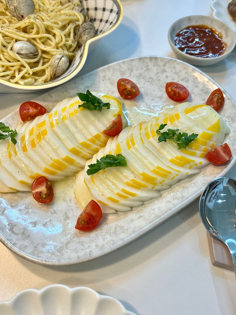 최근에 출산한 친구를 집에 초대해서 맛있는 한 끼 대접했습니다💙 최신 유행하는 참외샐러드, 누름 감자 갓 구운 루꼴라피자, 동죽파스타까쥐! 친구가 맛있게 먹어줘서 넘넘 기뻤어요😍