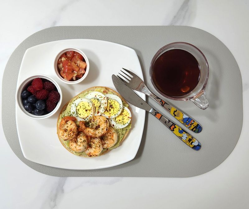 샐러드먹을때 넣는다고 구매한 냉동아보카도 다이스...ㅡ.ㅡ 너무 해동되니 물러지더라구요. 그래서 아보카도를 으깨서 과카몰리로 만들었습니다! 베이글 반 잘라서 살짝 구워주고. 과카몰리바르고, 구운새우와 삶은계란으로 반반 토핑해줬어요^^ 한접시에 샌드위치 놓고 과일 조금씩 놓고하니 나름 근사한 홈브런치가 완성되었네요^^