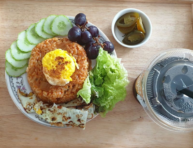 음식으로 다양하게 토핑해서 접시에 담은 볶음밥.