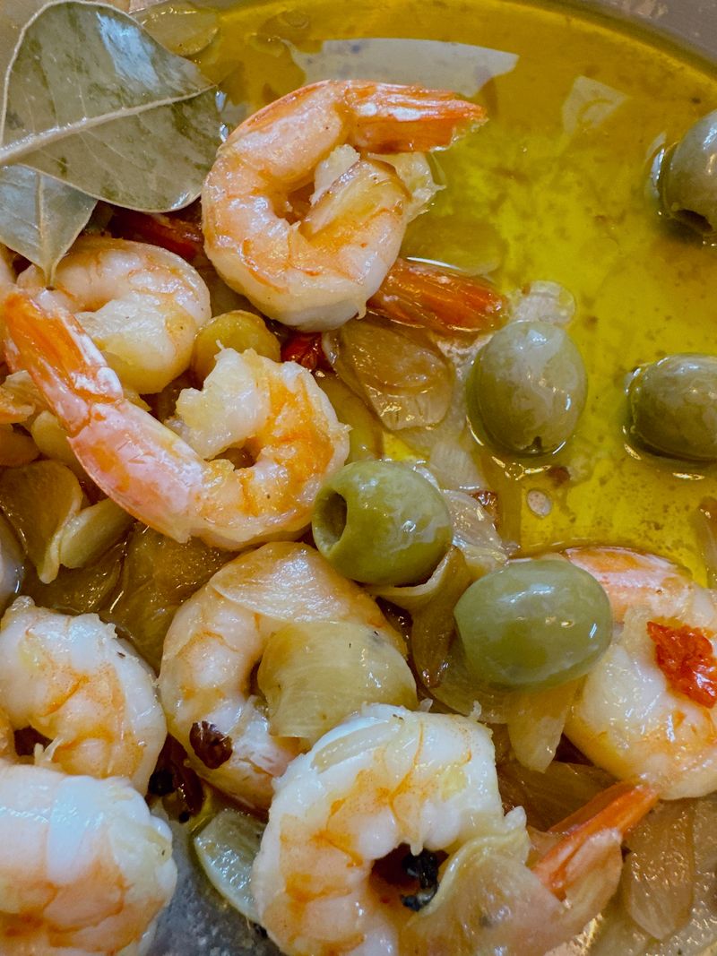 감바스!!! 새우도 듬뿍, 거기에 올리브까지 넣은게 엄청 맛있어보여요~ㅎㅎ 저 잎은 월계수잎인가요.....? (집에 월계수잎도 있으시다니!!)