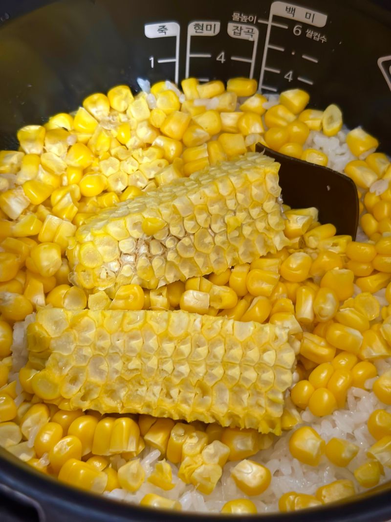 1)쌀 두 컵에 초당옥수수 하나를 넣고 밥을 합니다