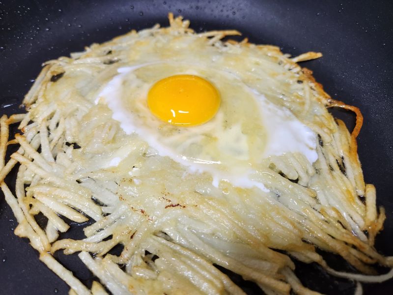 감자를 채썰어서(최대한 얇게 채썰어야 바삭해요) 도넛 모양을 하고 그 안에 계란을 하나 톡! 하고 깨넣어서 계란이 반숙이 될때까지 뚜껑을 닫고 익히면 끝! 감자를 노른자에 찍어서 먹으면 정말 별미중의 별미입니다. ^^