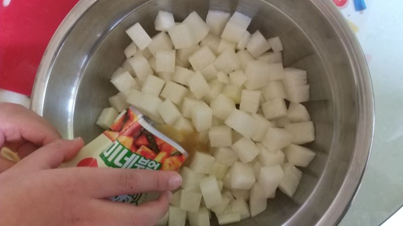 이렇게 아이가 직접 깍두기를 만들어 보니까 먹고 싶은 생각이 드는지 저녁에 깍두기와 밥을 맛있게 먹었어요.