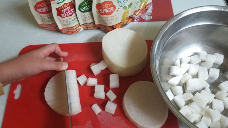 김치, 깍두기를 안 좋아하는 아들을 위해서 아빠가 집콕놀이로 깍두기에 도전했어요.