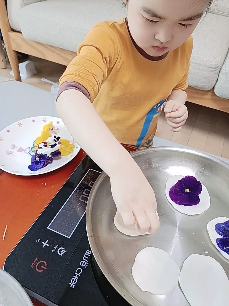 엄마와 함께 찹쌀가루를 반죽하여 화전을 만들어 먹었어요. 꿀에 찍어 먹으니 꿀맛이였어요.^^