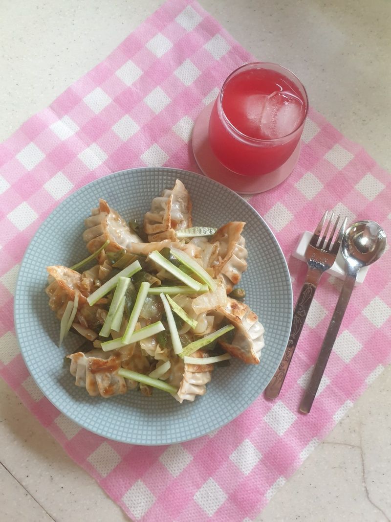 군만두에 새콤소스 뿌리고 상큼하게 오이 채썰어 올리면 만두탕수완성. 김치만두로 만들면 식어도 느낌함 없이 먹을수 있어 여름에 시원하게 먹기 좋아요
