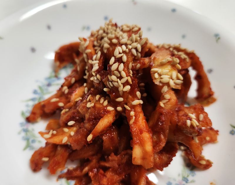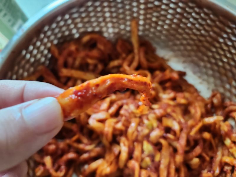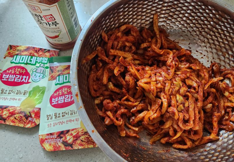 3 무말랭이에 고춧가루 넣고 버무린 뒤,