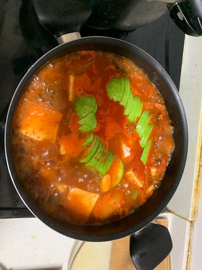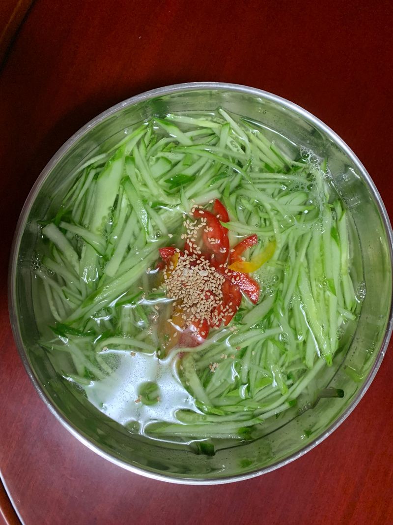 연두로 맛을 낸 오이냉국과 김치찌개에요.