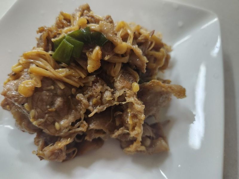 늘 구워만 먹던 차돌박이를 팽이버섯과 파를 넣어서 볶았어요. 간장, 굴소스, 설탕, 후추 비벼먹기도 좋고 그냥 구워먹는것 보다 더 푸짐하네요.