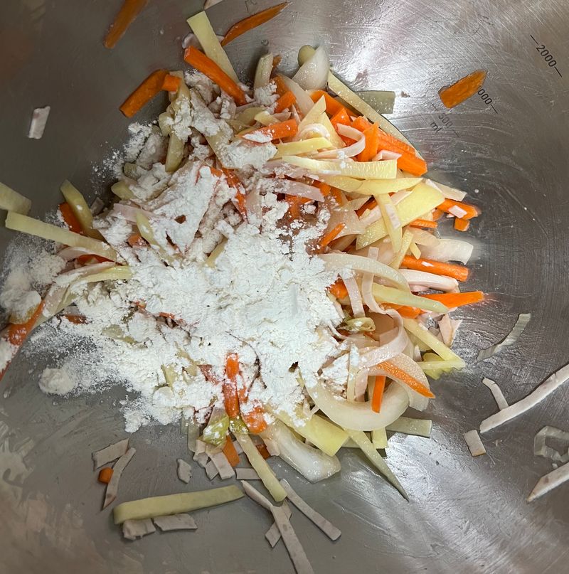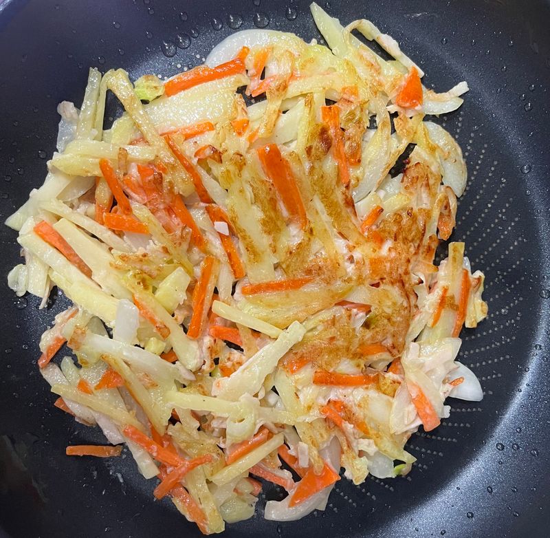 감자랑 당근으로 할 수 있는 요리를 생각하다가 당근감자전을 만들어봤어요~ 당근이랑 감자, 양파는 채썰고, 냉장고에있는 닭가슴살에 부침가루랑 달걀흰자를 넣어서 부치기!
