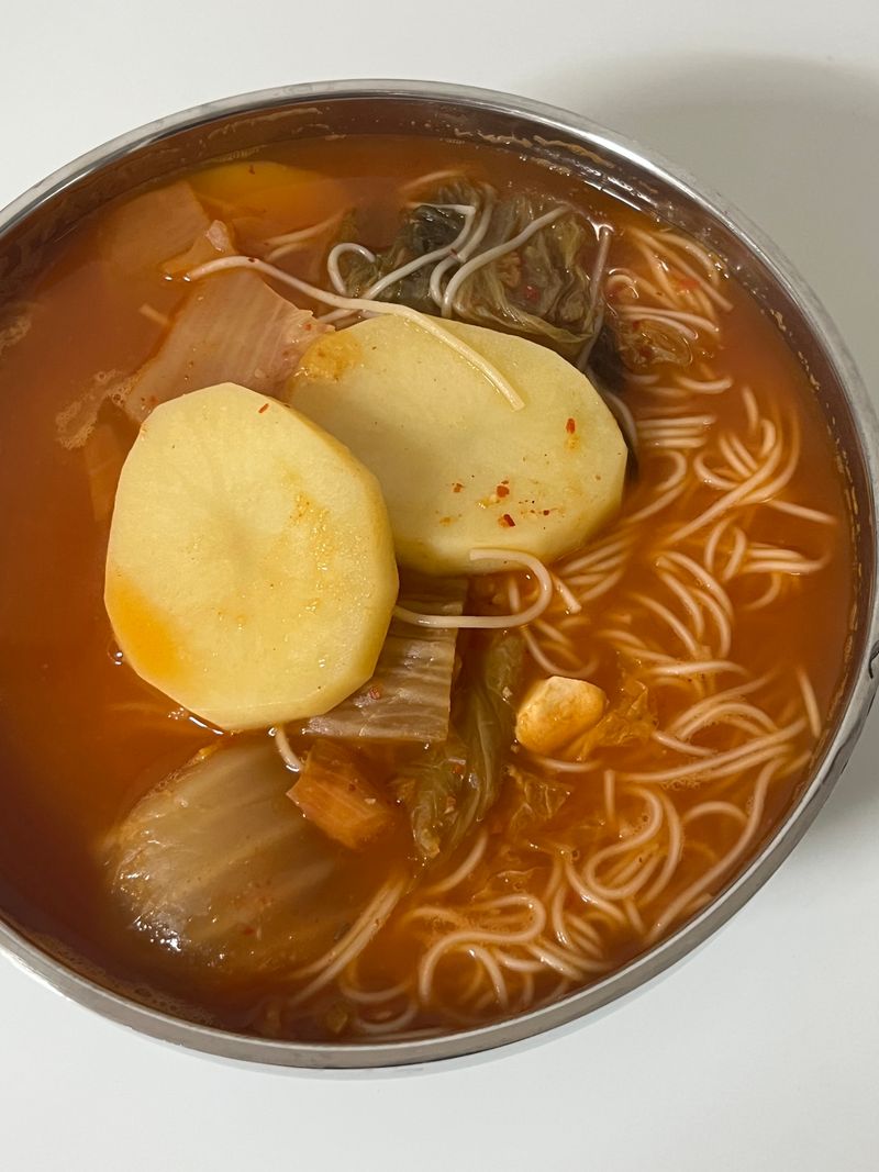 멸치 육수에 김치 + 김치 국물 살짝 + 다진 마늘 듬뿍 + 감자 넣고 끓이다가 소면 넣으면 완성~!