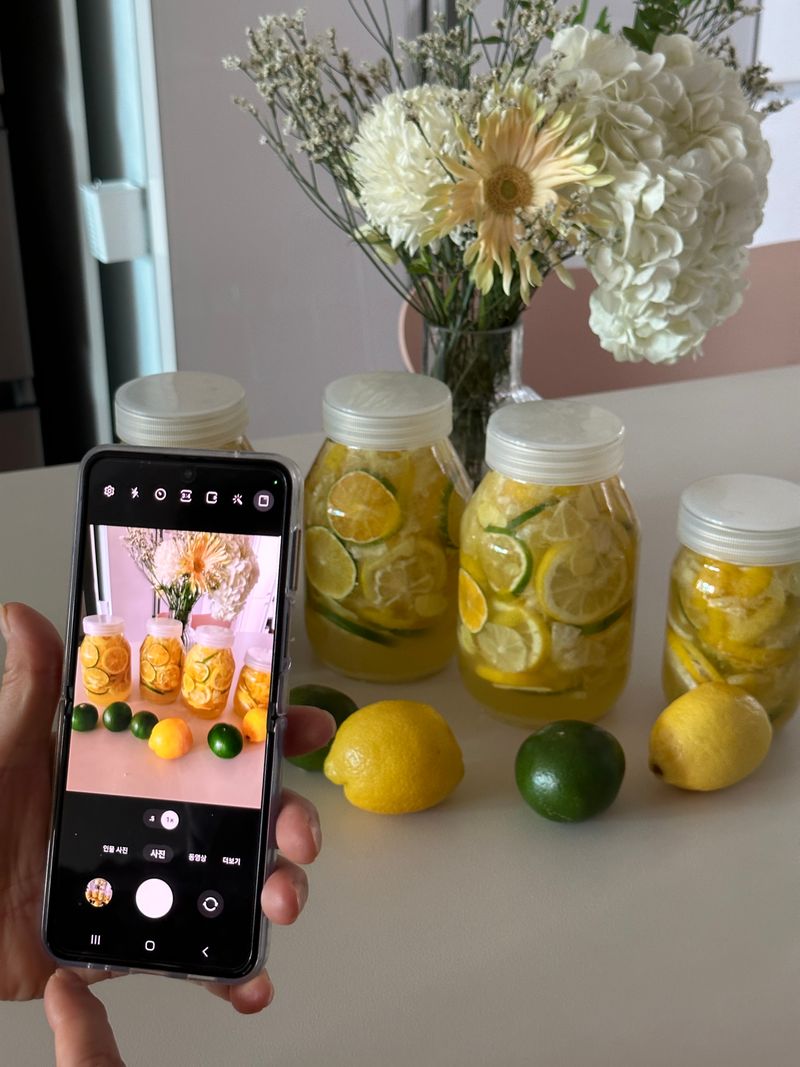 그래서 마침에 집에 청귤도 있어서 레몬만 후딱 주문해서 엄마랑 도란도란 이야기나누며 청귤레몬생강청을 담았네요. 다 만들고나서 엄마는 너무 이뿌다고 사진도 찍으시더라구요~