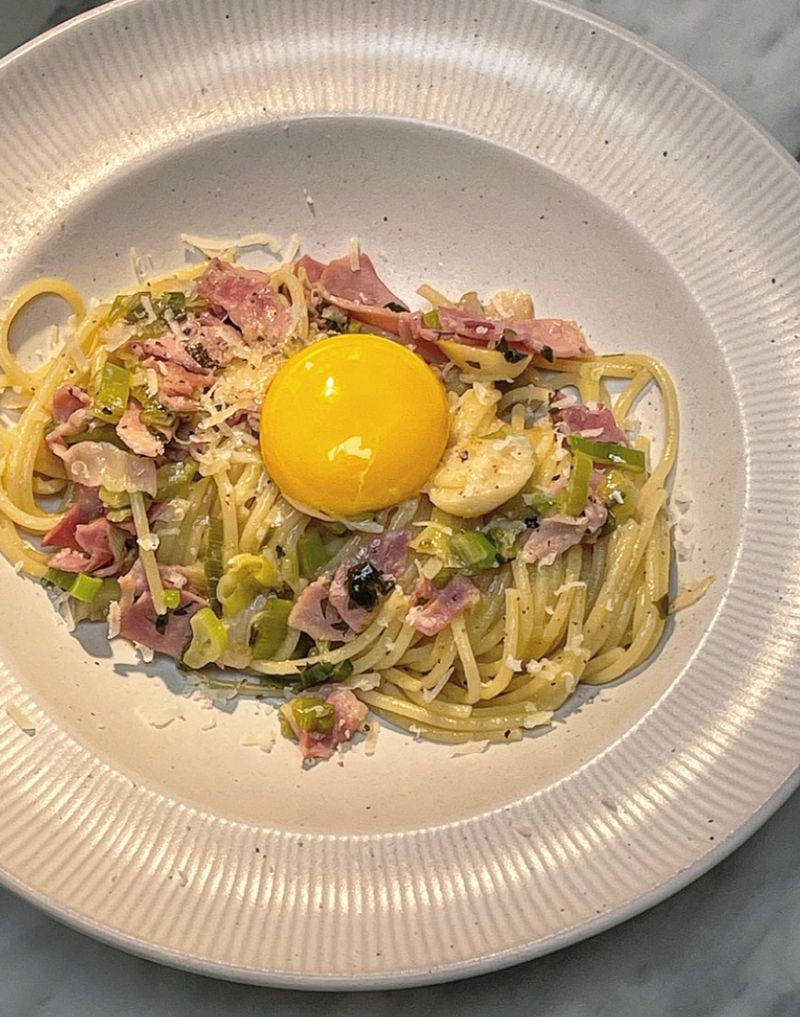 계란 노른자를 터트려 면에 비벼먹으면 너무나 고소하고 부드러운 대파베이컨 파스타 완성💛