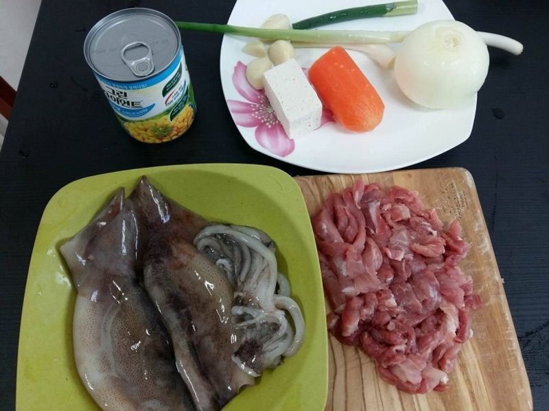 오징어 몸통은 그대로 , 다리는 잘게 다져서 두부, 파,당근,다진고기,마늘조물조물 양념을 만들고