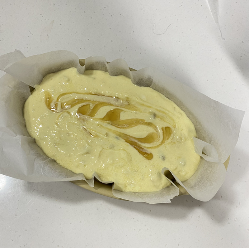 4. 용기에 종이호일 무심히 깔고 반죽 올린 후 맨 위에 설탕 조금, 꿀 조금 올리기