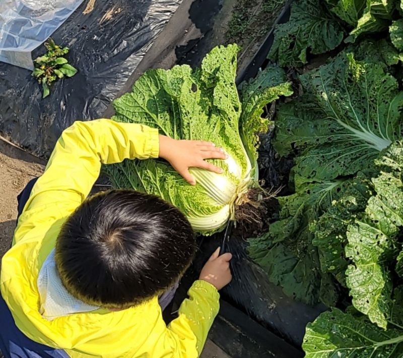 아이랑 열심히 키운게 수확할 때가 되서 배추 뿌리도 자르게 하고 무도 뽑아와서 간단한 김치를 만들었어요.