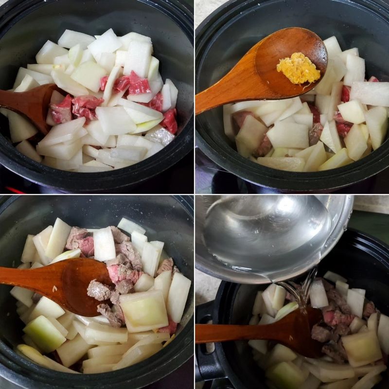 무는 두툼하게 썰어서 함께 볶아준후 쌀뜨물을 넉넉하게 넣어주세요.