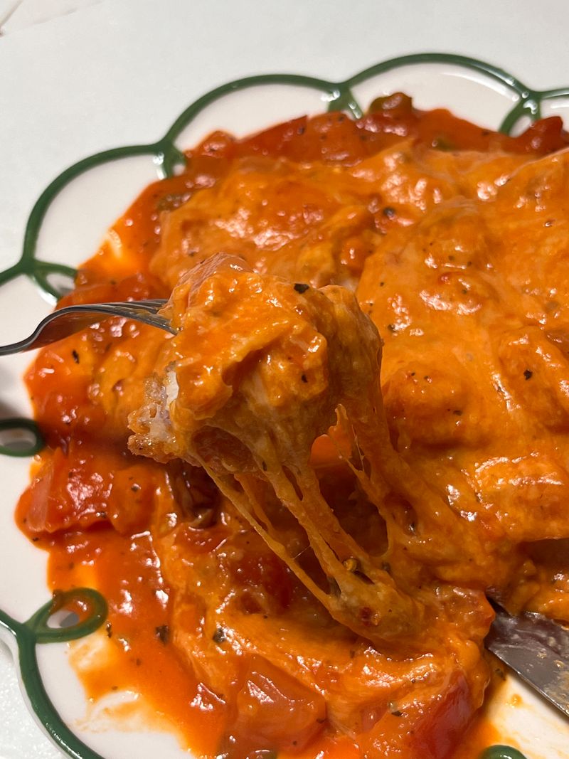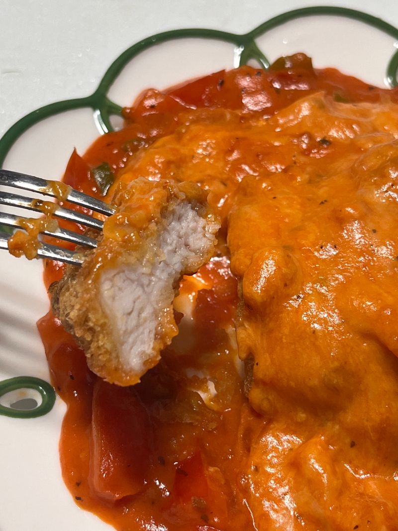 > 남은 파스타소스에 모짜렐라치즈 넣어 녹여주고 돈가스 위에 뿌려주면