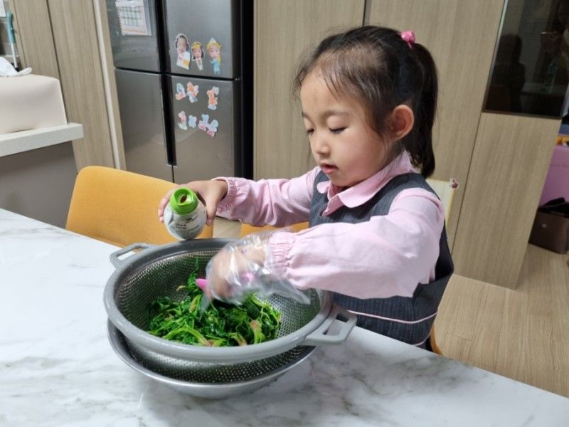 나물 진~짜 안먹는아이... 엄마와 같이 손질도 해보고 데치고 간까지 했더니 먹네요!! 많이 먹진 않았지만 조금이라도 먹었으니~♡ 같이 요리하기 성공입니다!!