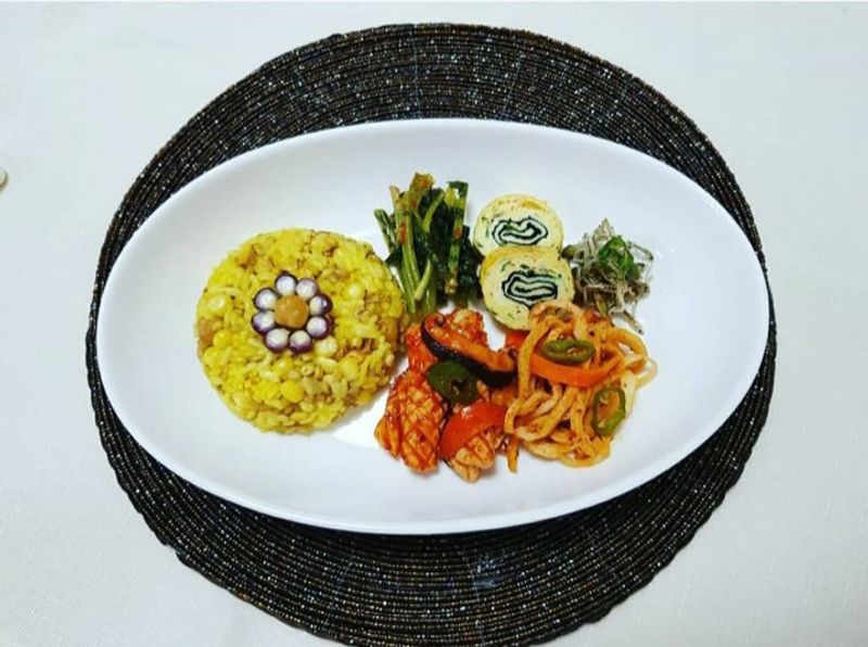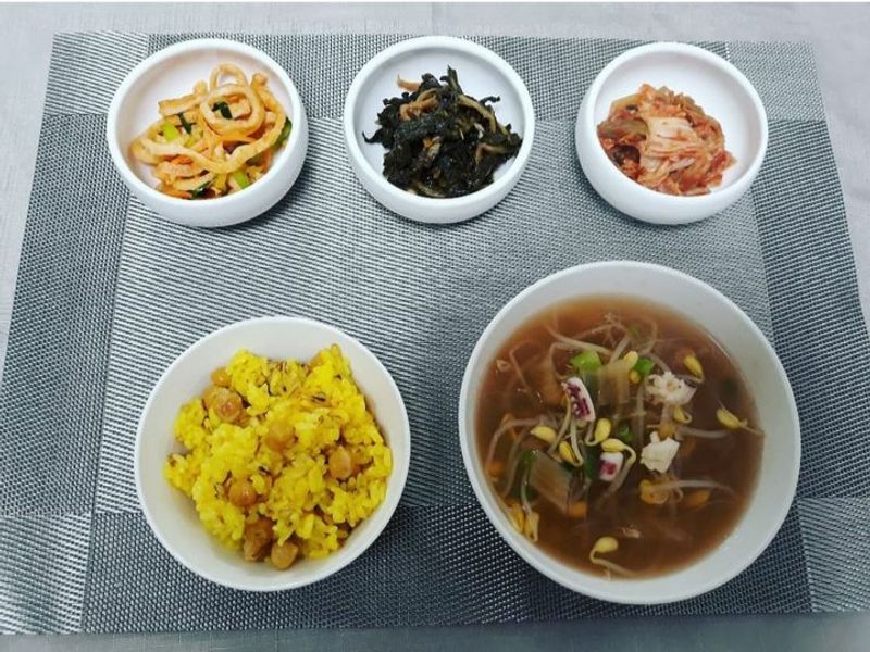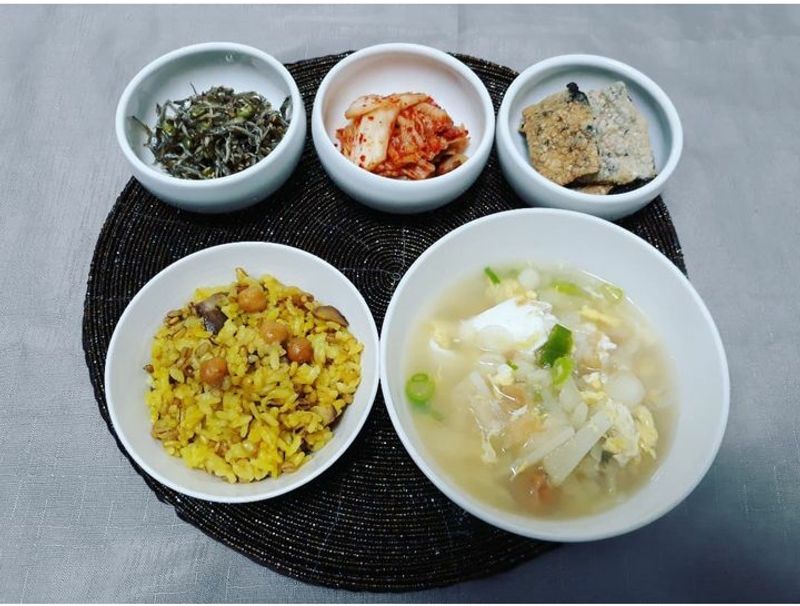 밥은 강황가루, 콩등 한 두가지 더 넣어 밥을 짓고 천연 조미료를직접 만들어 국과 반찬을 만들어요.