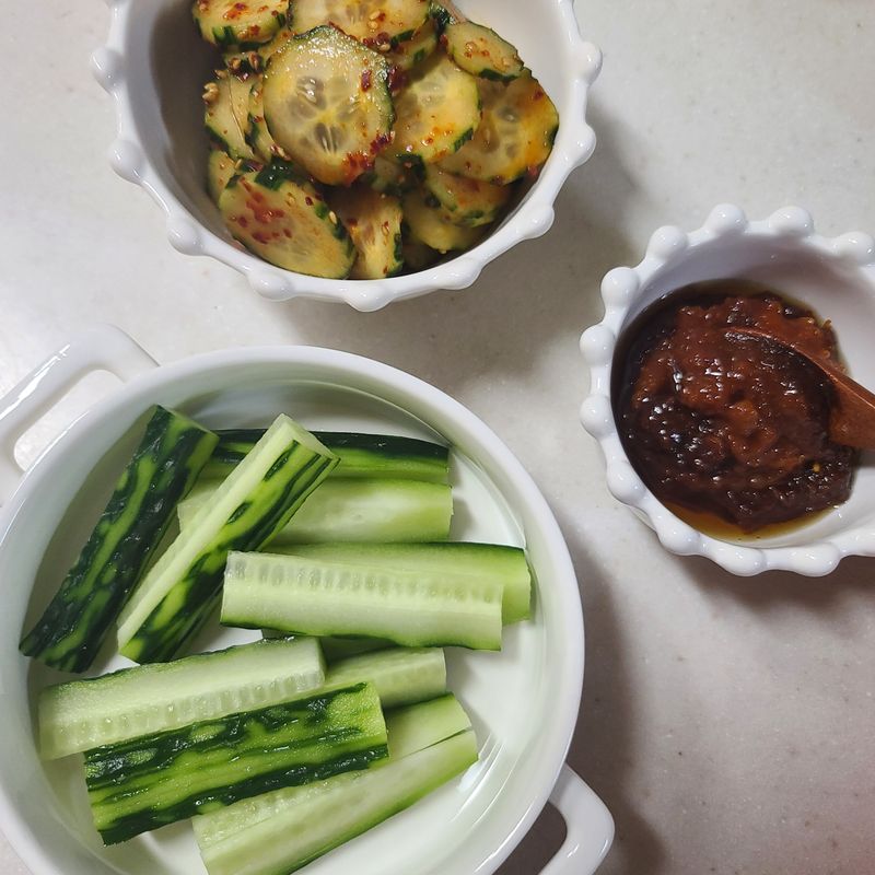 오이 썰어 소금 간이 될 정도로만 하고 식초1,설탕1, 깨, 고춧가루 넣고 버물버물했어요. 쌈장에 찍먹 할 오이스틱도 썰구요~