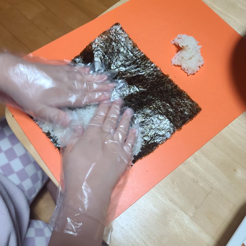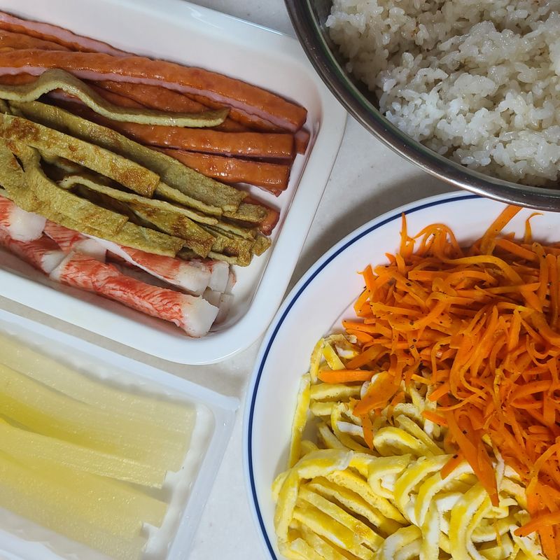 저는 재료를 장만하고 아이들이 김밥 말 수 있게 세팅을