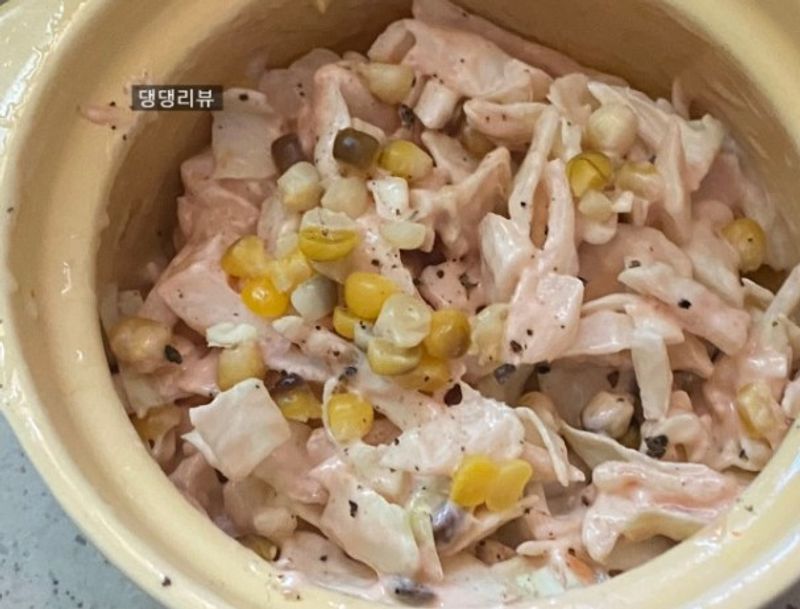 옥수수를 넣어서 식감이 더 좋을것 같아요. 모닝빵에 넣어먹음 더 맛있을것 같네요.