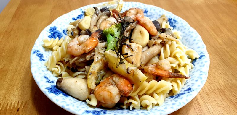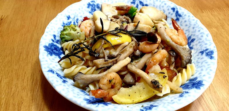 버섯, 브로콜리, 파스타를 넣고 달달 볶은 다음 풍미를 위해 레몬, 로즈마리, 베트남 고추를 넣어주고