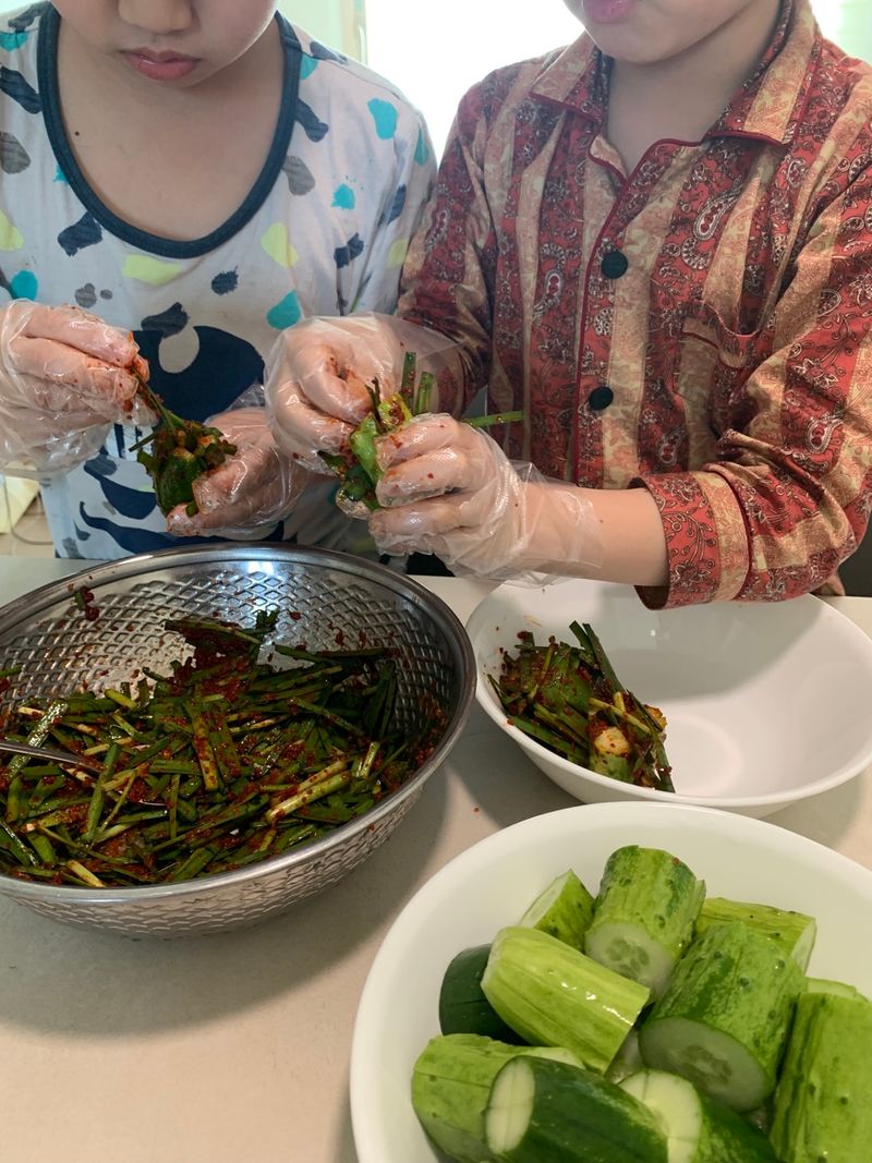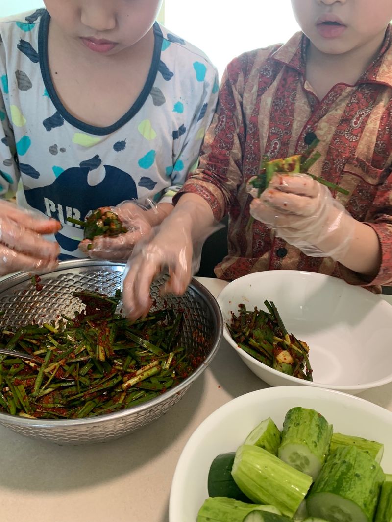 오이 소박이 레시피에 따라 아이들과 직접 재료를 손질하고 신나게 양념을 버무렸어요.