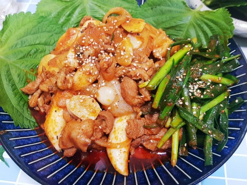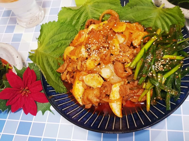 팬을 달군다음 재워둔 오리고기 넣으며 휙휙 저어주기 어느정도 익었다 싶으면 양파 떡복이 떡 넣고 5분간 더볶아주기 프라이팬에 남아있는 소스와 기름에 부추를 넣고 센불로 한번 더볶기 깻잎 쌈무