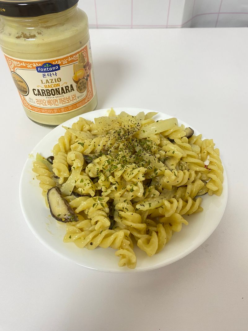 집에서 소스랑 햄 버섯 야채 넣고 버터랑 볶아주면 감칠맛 팡팡 이에요