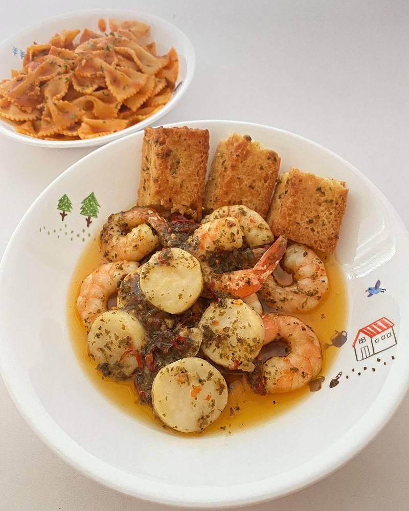 버터 한조각 넣고 새우와 관자 넣고 천천히 익혀주면서 후추와 소금 살짝으로 간 맞추면 완성이에요